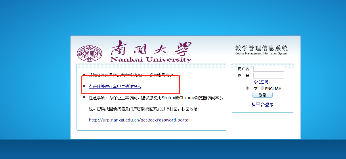 有意向的应届高中毕业生可通过手机或者电脑登录南开大学“教学管理信息系统”(http://eamis.nankai.edu.cn/eams/login.action)点击“高中生选课报名”进行网上报名。