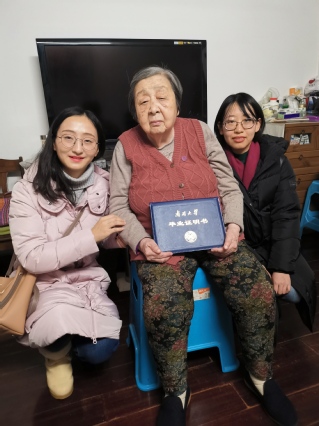 下午5点左右,我们来到段大珍老人的家中,家里不大,却格外温暖。我们将毕业证明书、南开大学校徽、南开大学百年徽章和南开百年校庆茶礼送予老人,老人家开心的像个孩子,直说开心,谢谢,并将南开百年徽章佩戴在胸前,双手捧着证明书与我们合影留念。由于身体原因,老人家不能用过多的言语表达内心的激动,但是从一直拉着我们的双手和上扬的嘴角,能看出这份迟来的证明书对老人而言,分量有多重。