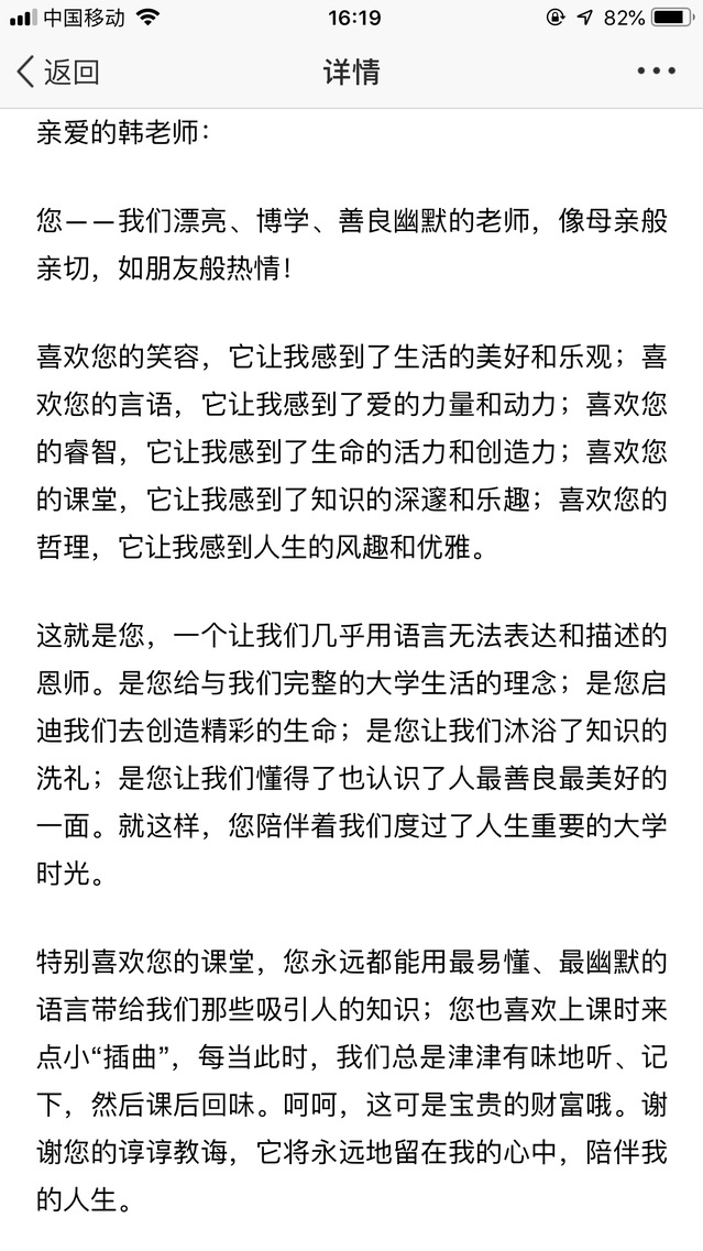 韩立红老师通过一个个温暖的故事,图文并茂的向大家介绍了他作为老师在课堂上、课堂外,作为班导师,作为学业指导老师,在学生毕业后和学生亦师亦友等几个角色时,与同学们发生的点点滴滴。韩老师分享到:“我们要像爱家人一样爱学生,要有情感的投入,让学生愿意和我们在一起”。
